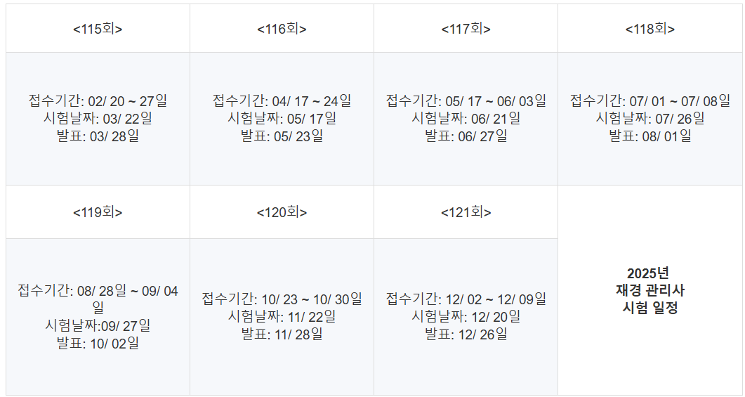 재경관리사 시험은 시험 일정과 접수 기간을 미리 파악해 효율적인 학습 계획을 세우는 것이 필요합니다.